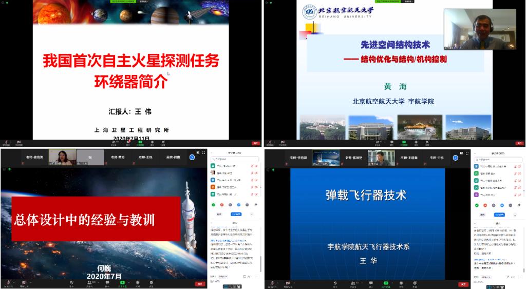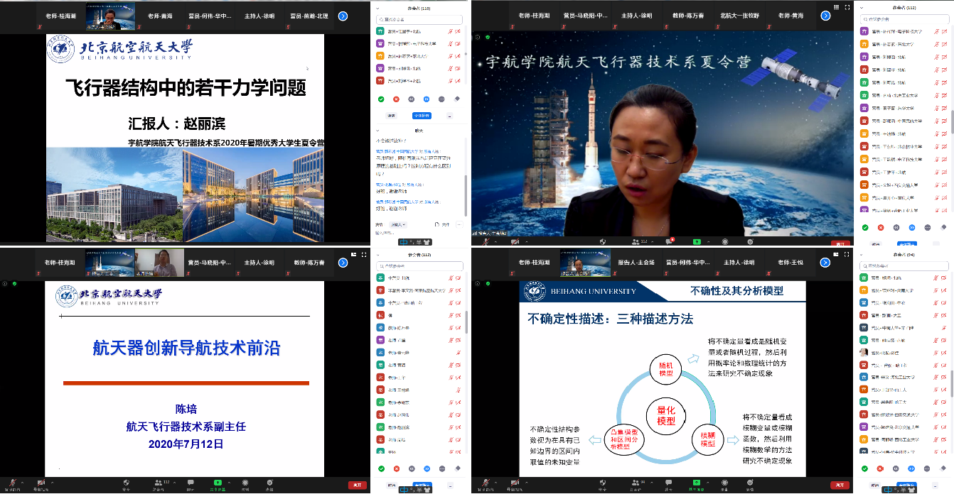 7月11日上午9点本次暑期夏令营正式线上开营,开幕式由宇航学院航天飞行器技术系党支部书记陈珅艳老师主持。宇航学院研究生教学副院长王伟宗教授介绍了北航宇航学院的基本情况和研究生招生政策,谈到了宇航学院科研团队支撑国家和国防重大项目,为国家和国防建设做出了突出贡献,展示了北航宇航学院在立德树人和高水平科研工作中所取得的重要成果,激发了夏令营青年学子投身祖国航天建设的担当与奉献精神。航天飞行器技术系主任黄海教授详细介绍了航天飞行器技术系的发展历程和现状、未来。航天飞行器技术系副主任赵丽滨教授介绍了宇航学院航天飞行器技术系的研究生招生政策和研究生学习、学业情况,鼓励大家踊跃报考宇航学院2021级研究生。宇航学院研究生指导主任王晓慧老师介绍了宇航学院研究的就业和工作情况。