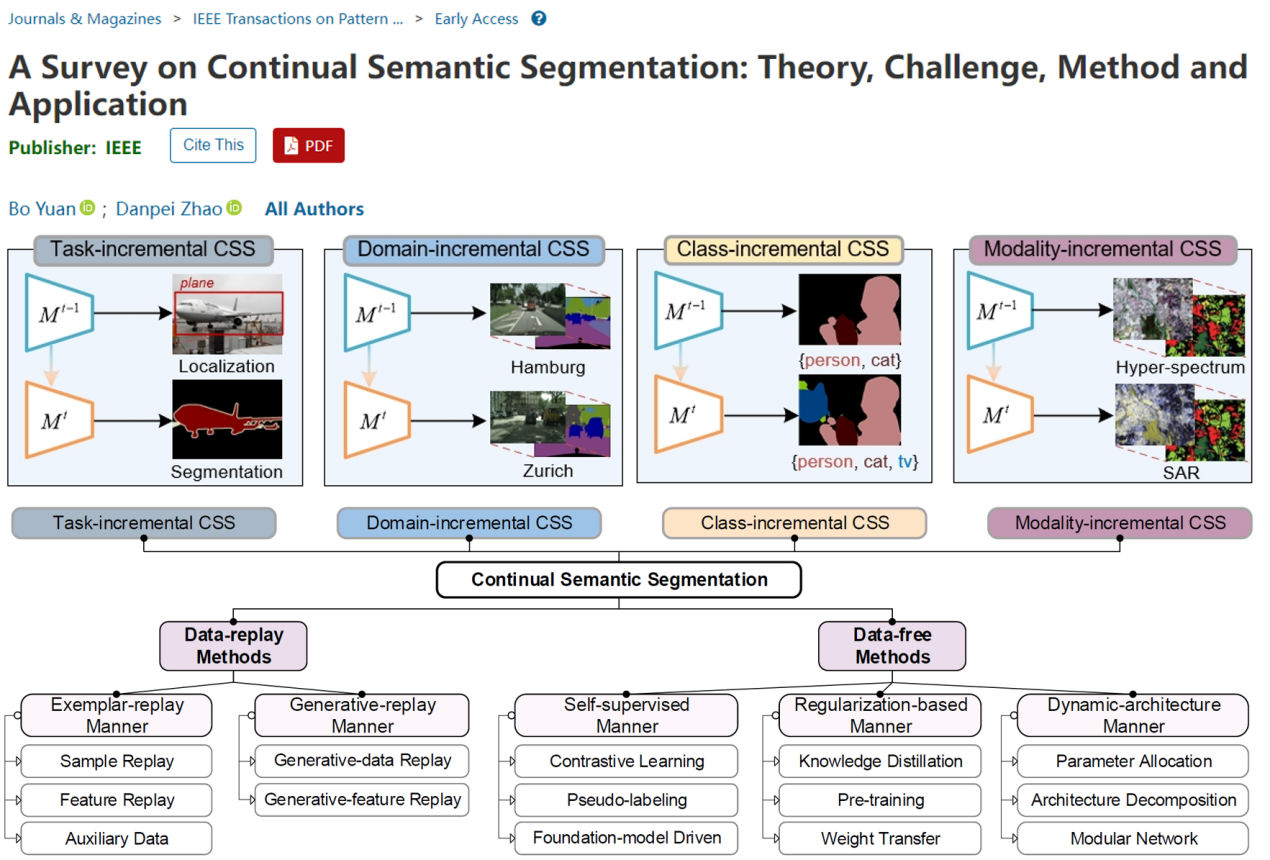 在上述研究基础上,赵丹培老师团队发表领域内首篇持续语义分割综述。该论文面向分割任务的终身学习综述,首次涵盖四种任务模式,两类技术途径,五种算法设计,十四类模型架构,建立一个开源的项目主页,支持持续学习算法的构建与应用。该综述全面调研了持续语义分割领域的挑战、方法、数据集、定性定量评价、交叉学科应用以及未来发展趋势等,可为相关领域的研究人员提供重要参考和启发,为终身学习领域的发展提供研究路线和技术基础。(论文链接:http://ieeexplore.ieee.org/abstract/document/10643308)