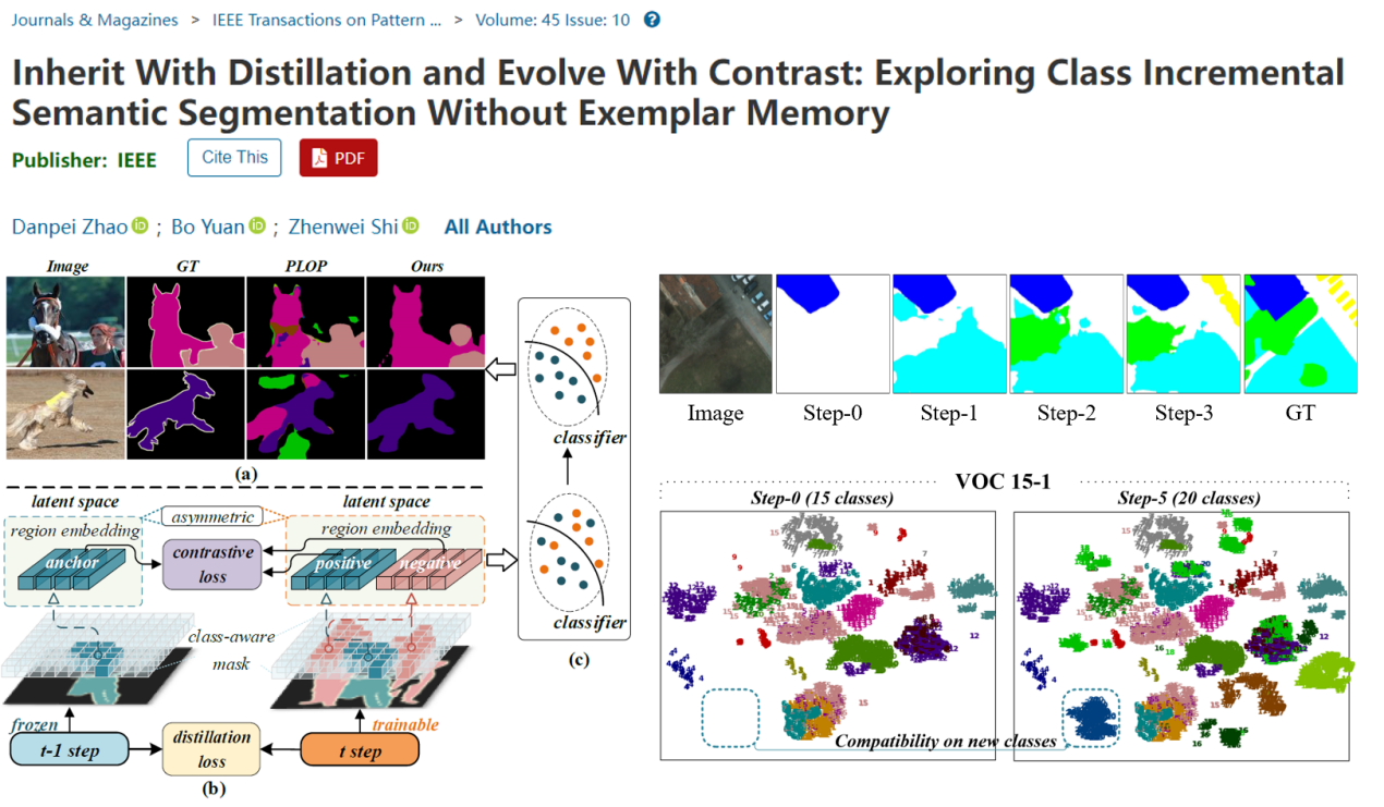 针对持续学习技术中对旧数据依赖程度高的问题,赵丹培老师团队提出无数据回放条件下的持续语义分割方法。通过研究持续学习中的灾难性遗忘和语义漂移问题的内在数学机理,针对类别增量持续语义分割任务提出了一种基于多层级知识蒸馏和非对称区域对比学习的模型增量更新方法,克服灾难性遗忘难点,能够在无数据回放的条件下实现模型的自主更新。所提出的模型在通用数据集和遥感数据集上均取得了领先的性能表现。(论文链接:http://ieeexplore.ieee.org/abstract/document/10120962)