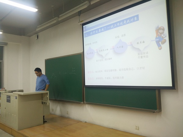 宣讲过程中,高琨鹏详细介绍了找工作的基本过程,包括准备简历,投递简历,笔试,复试等过程,还详细介绍了系统内外专业的区别以及相应的努力方向,建议要多向学长学姐吸取经验,并叮嘱我们一定要明确自己的梦想所在,找准目标,马上准备。王军杰则从找工作的技巧方面做了比较详细的介绍,提醒现在要立足基础,忙碌起来,做好自己的本职工作,适度锻炼自己的口才,多做项目,提高自己的技术能力。