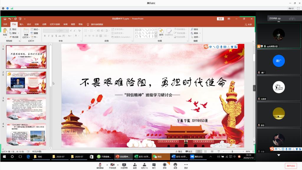 2020年7月10日下午,ZY19152、SY19152和博士信息工程党支部联合组织开展了一次学习活动。本次活动由SY19152班陈科研同学主持,带领大家一起学习习近平总书记回信精神。共54人参与,邀请辅导员李开阳、晋达睿参与本次会与。
