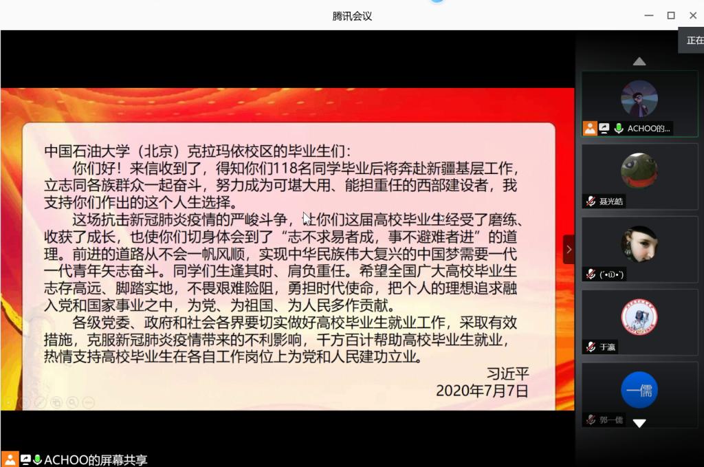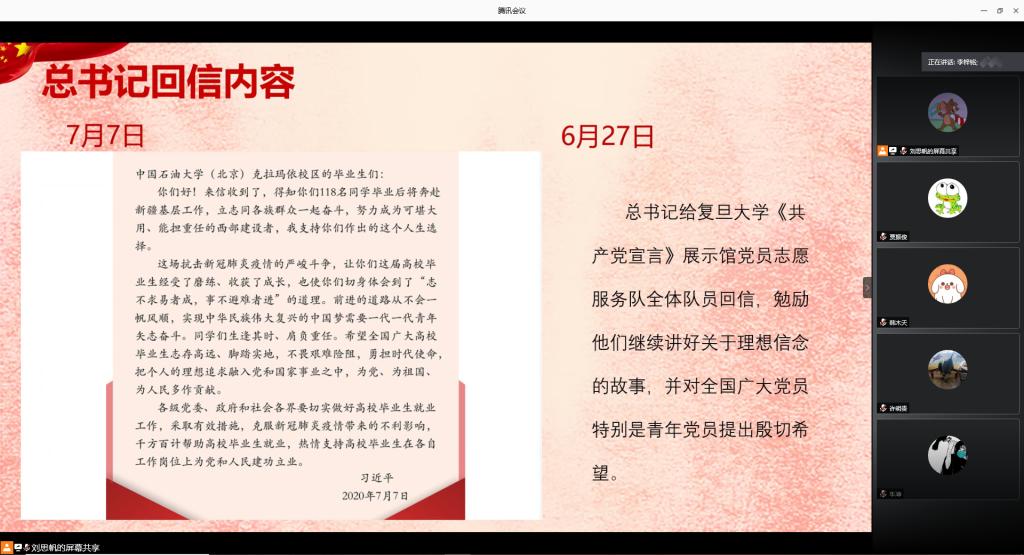陈科研同学带领大家重点学习了总书记给中国石油大学(北京)克拉玛依校区的毕业生们的回信。