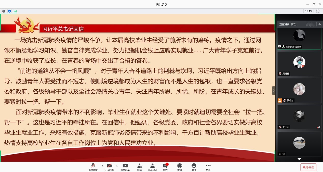 第一项,由李正宇带领大家观看习近平总书记回信新闻视频。视频结束后,李正宇同学发表了自己的看法。接下来进行会议第二项内容,杨院长讲话。针对习近平总书记的回信,杨院长与大家交流关于他的学生扎根基层工作的故事。他希望我们大家将自己的命运与党和国家的发展联系在一起,挥洒汗水,绽放青春!最后,杨院长希望同学们利用本次学习会的机会,充分交流以抚平半年的思念,同时希望我们能稍安勿躁,听从党和国家的指挥,听从学校的领导,打赢最后的攻坚战!