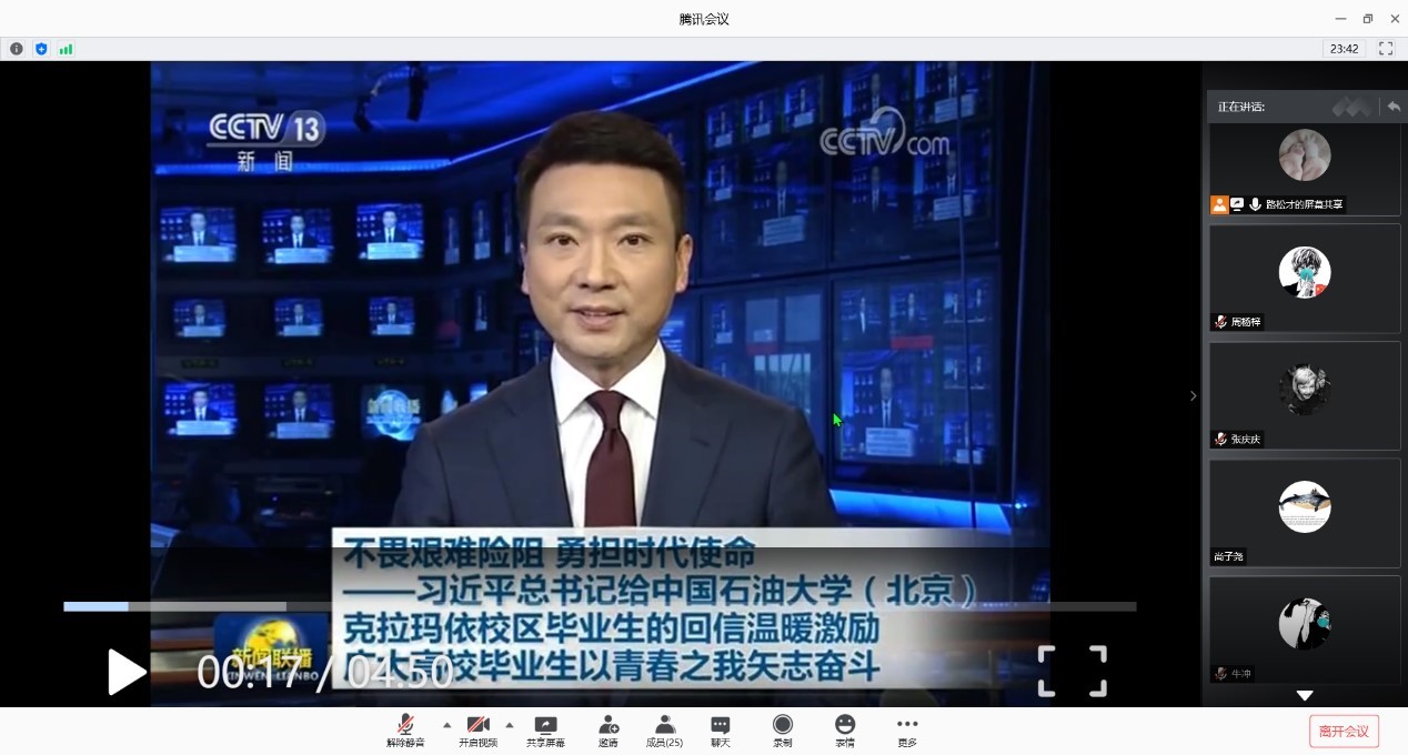 会议开始,路松才同志先对此次会议内容做了介绍,并声明了此次会议的几点要求,之后路松才给大家播放了关于习近平总书记7月7日给中国石油大学(北京)克拉玛依校区毕业生回信的新闻简讯,大家对于回信的始末和回信的内容都有了一定了解。